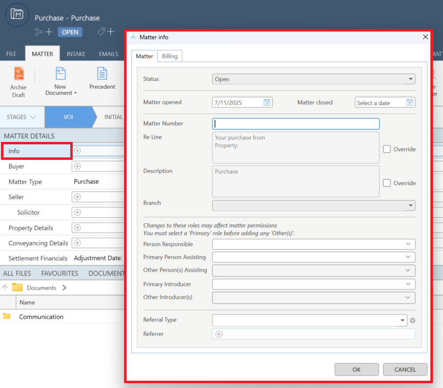 Double-clicking on Info opens the Matter info window where you can complete matter-specific actions such as: