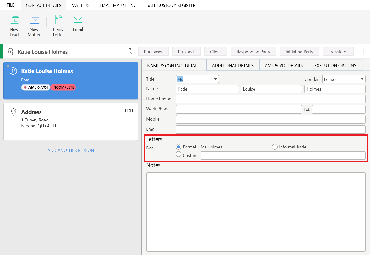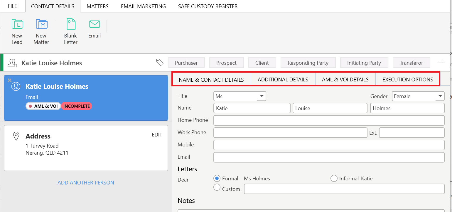For Individual contact cards, the Name & Contact Details, Additional Details, AML & VOI Details, and Execution Options tabs are where you will enter all the information for a contact.