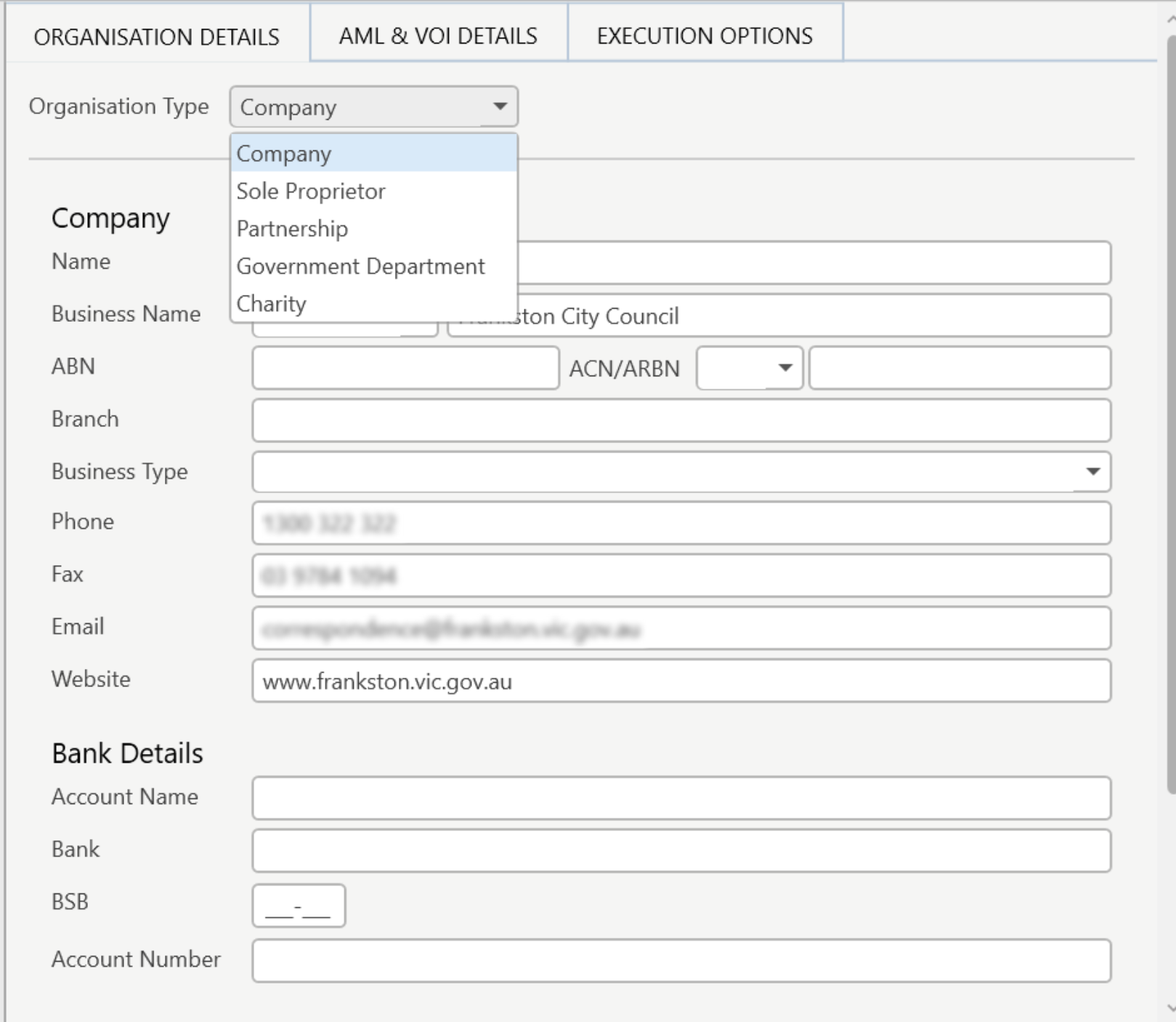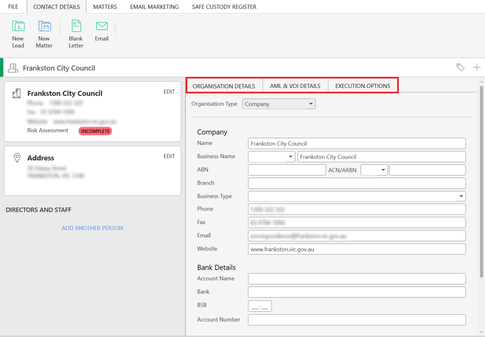 For Organisation contact cards, the tabs available are the Organisation Details, AML & VOI Details, and Execution Options.
