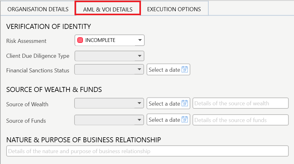 The AML & VOI Details tab is where you enter information regarding the organisation's AML status. This is a requirement as per AML/CTF Tranche 2 regulations coming into effect from July 1 2026.