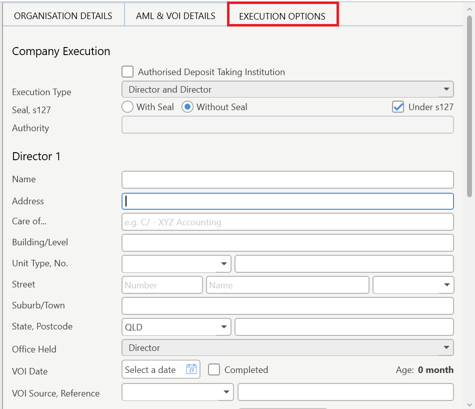 The Execution Options tab is where you enter information about the Company Execution, including the details and AML status of up to 2 directors.