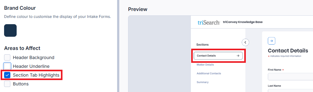 The brand colour will be displayed under the following Areas to Affect if you tick any of the selections: